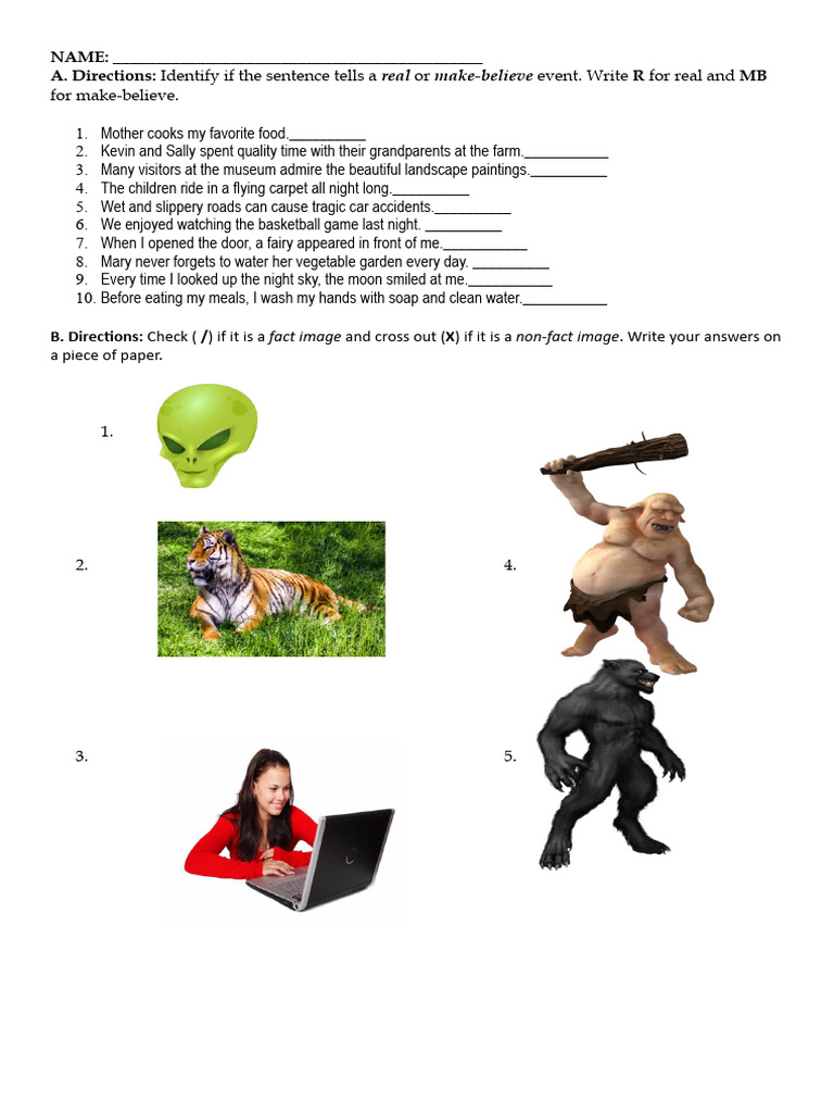 A. Directions: Identify if the sentence tells a real or make-believe event. Write R for real and MB