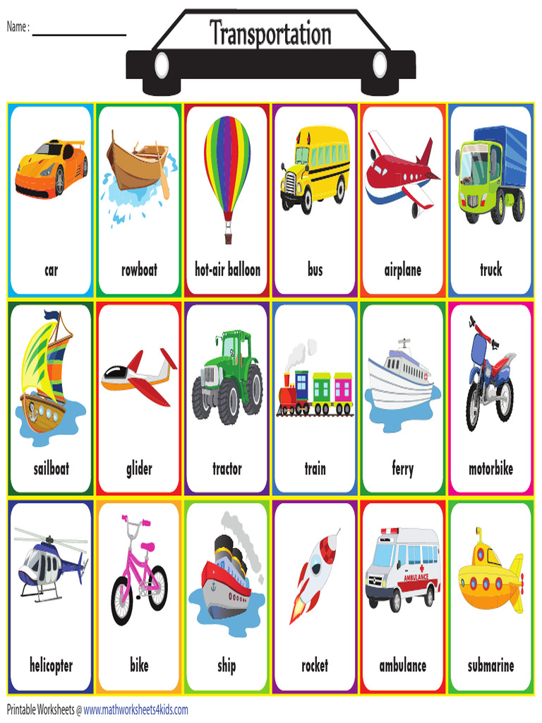 This document lists various modes of transportation including cars, buses, airplanes, trains, boats, and more unconventional vehicles like hot-air balloons, gliders, and rockets. It also includes emergency vehicles like ambulances and lists the vehicles in a grid format without descriptions for each.