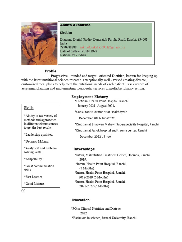 *Dietitian at Jaslok hospital and trauma center, Ranchi
