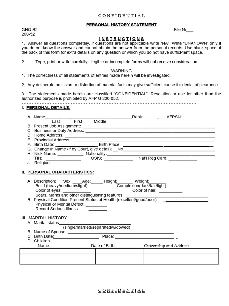 PERSONAL HISTORY STATEMENT
