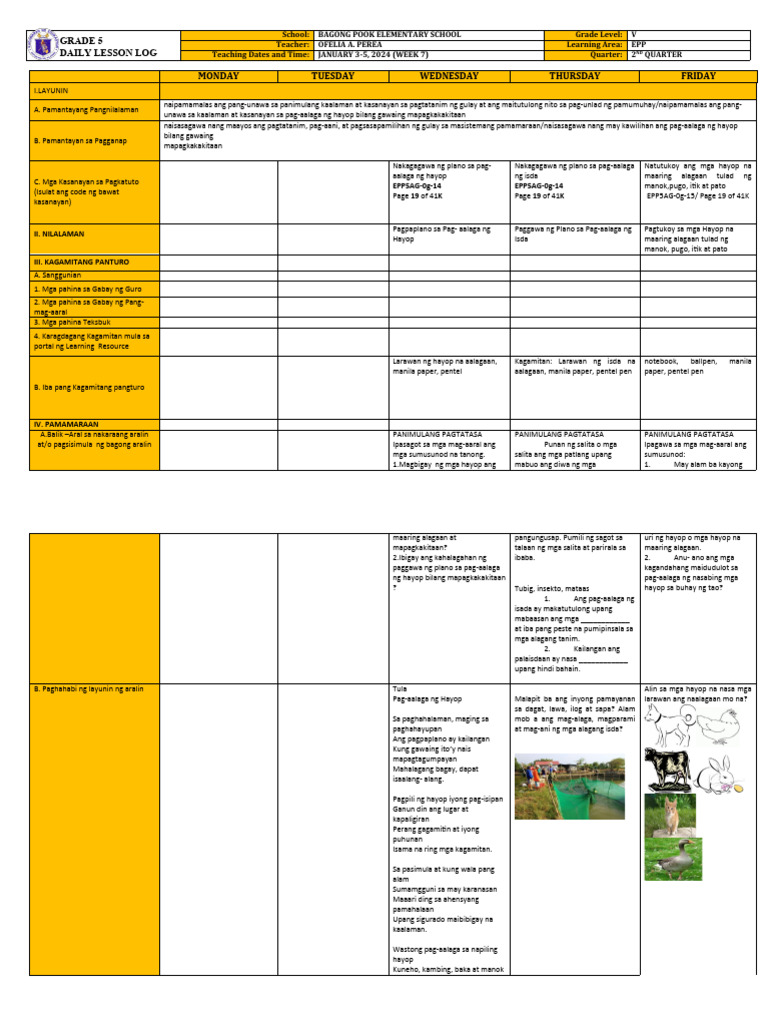 C. Mga Kasanayan sa Pagkatuto EPP5AG-0g-14 EPP5AG-0g-14 manok,pugo, itik at pato