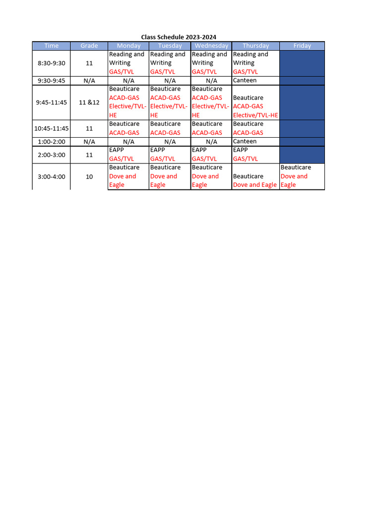 Class Schedule 2023-2024