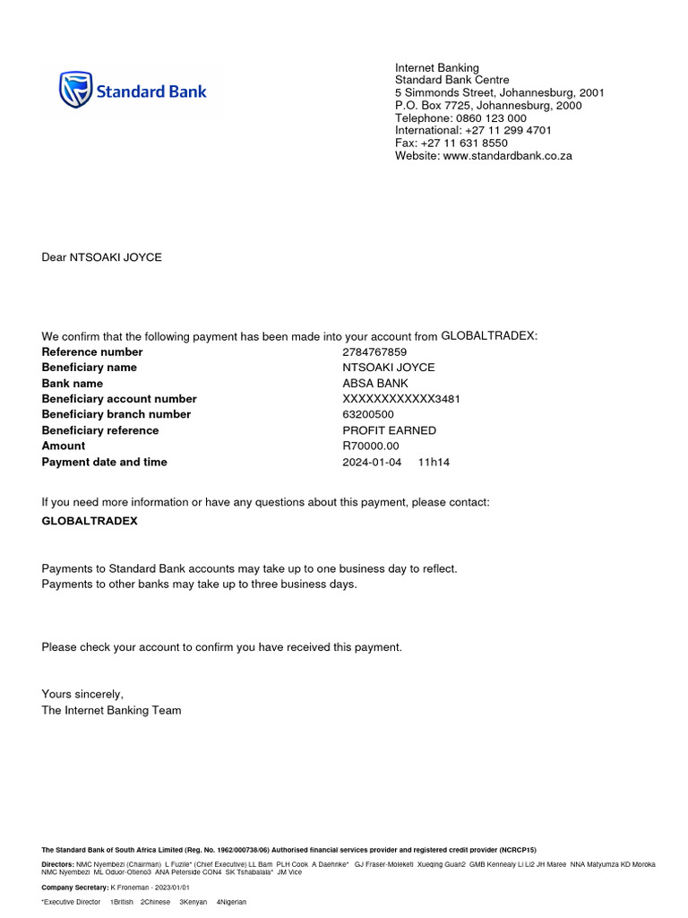 The Standard Bank of South Africa Limited (Reg. No. 1962/000738/06) Authorised financial services provider and registered credit provider (NCRCP15)