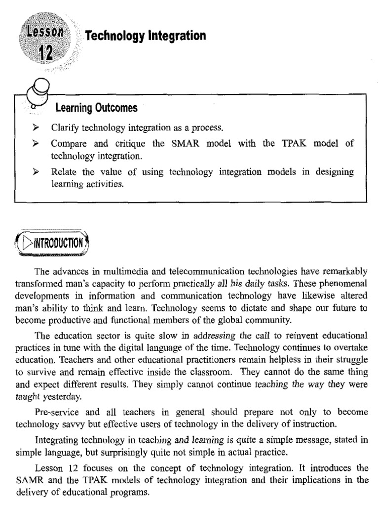 Lesson 12 focuses on the concept of technology integration. It introduces the