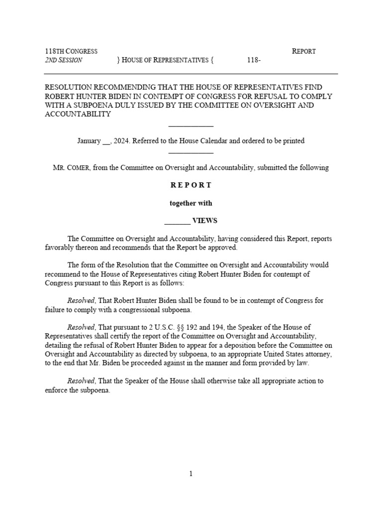 { 118- RESOLUTION RECOMMENDING THAT THE HOUSE OF REPRESENTATIVES FIND ROBERT HUNTER BIDEN IN CONTEMPT OF CONGRESS FOR REFUSAL TO COMPLY WITH A SUBPOENA DULY ISSUED BY THE COMMITTEE ON OVERSIGHT AND ACCOUNTABILITY ____________ January __, 2024. Referred to the House Calendar and ordered to be printed ____________ M