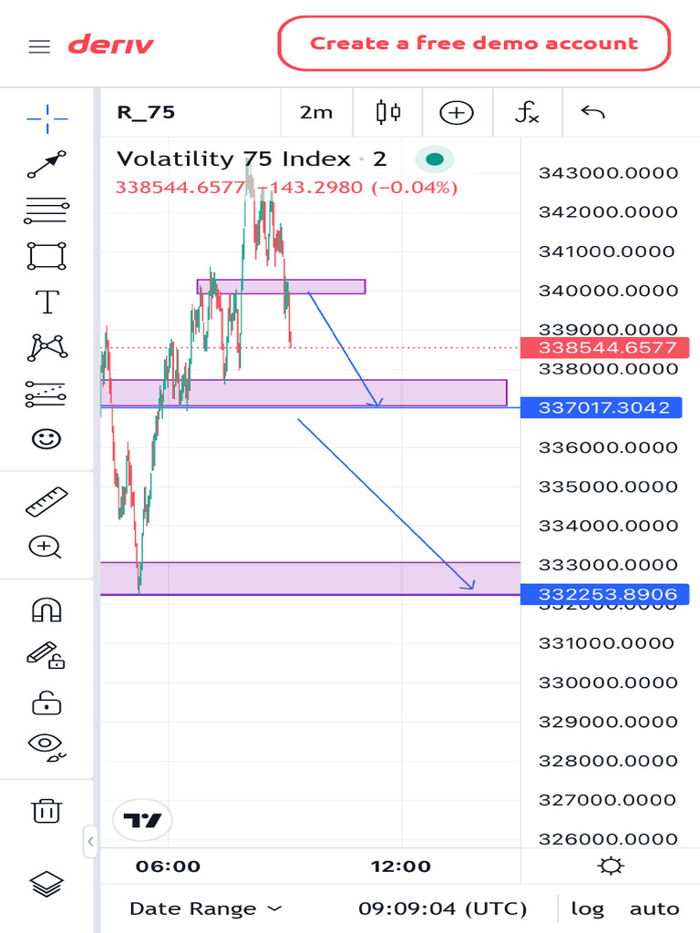 The document provides instructions to create a free demo account and displays market data for the Volatility 75 Index, including the current price of 338544.6577, a decrease of 143.2980 (-0.04%) from an earlier price. It allows selecting a date range and includes an option to log automatically.