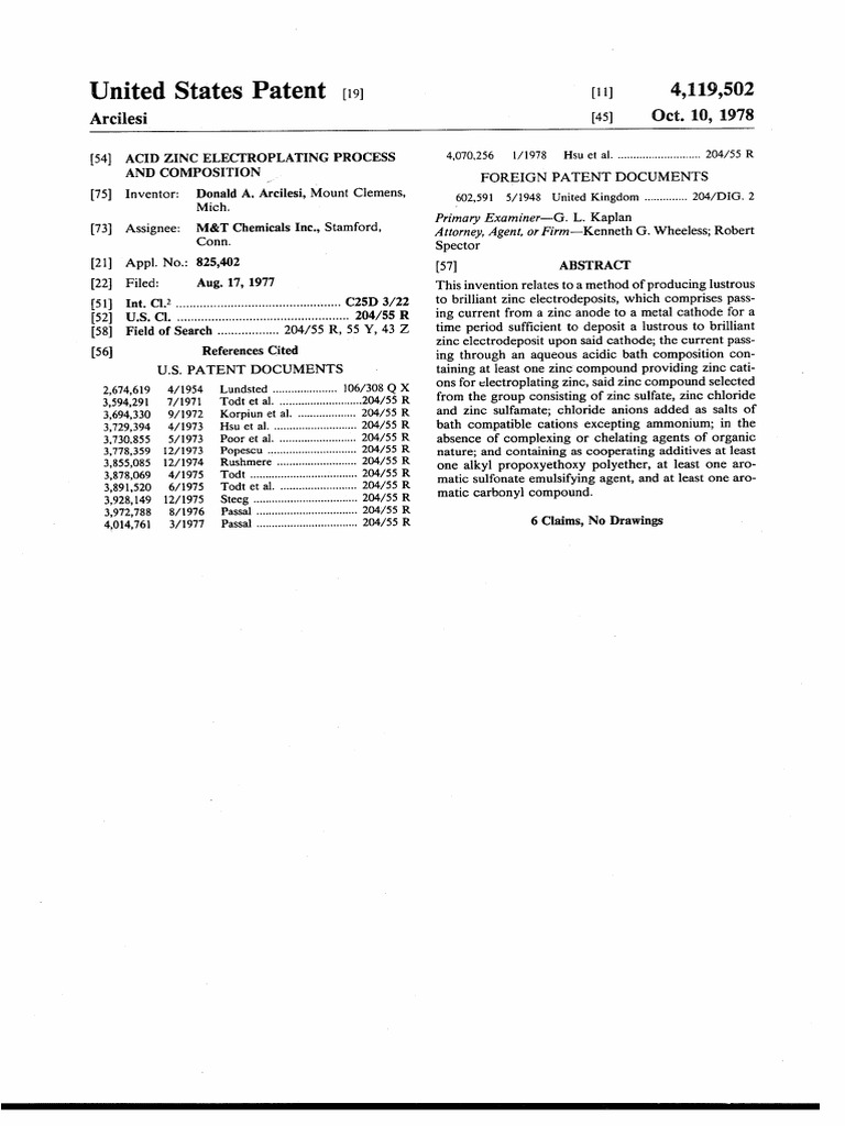 (54) ACID ZINCELECTROPLATING PROCESS 4,070,256 l/1978 Hsu et al. ........................... 204/55 R