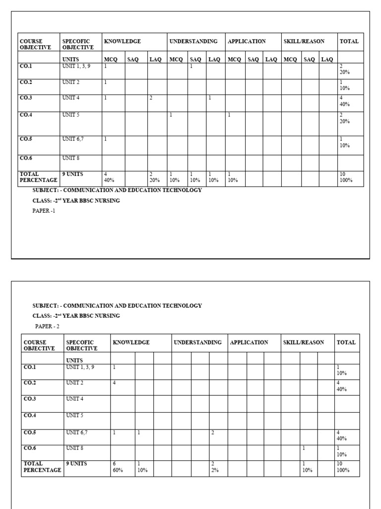 COURSE SPECOFIC KNOWLEDGE UNDERSTANDING APPLICATION SKILL/REASON TOTAL