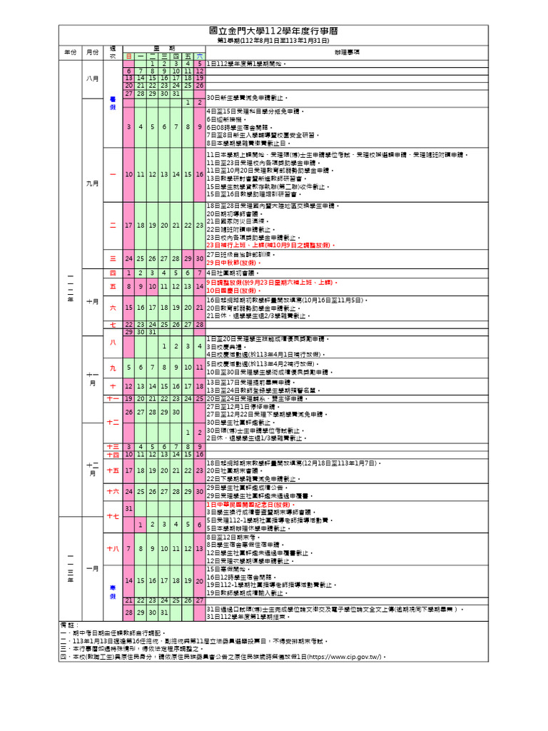 國立金門大學112學年度行事曆