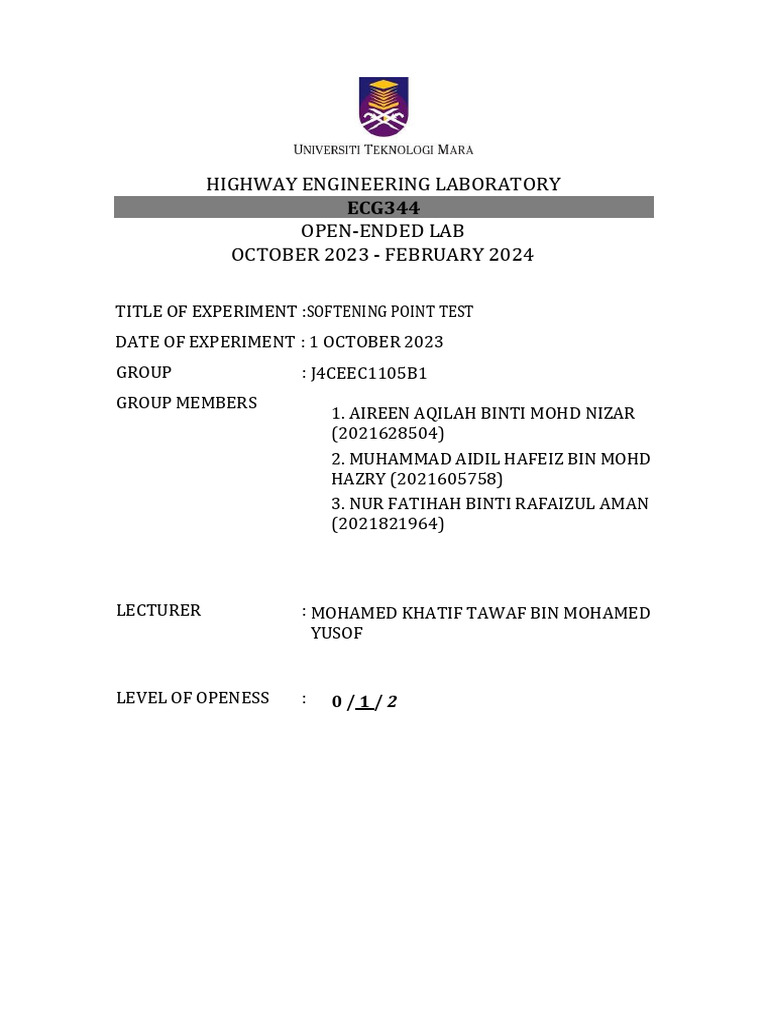 Name of field work : LABORATORY 9: SOFTENING POINT TEST