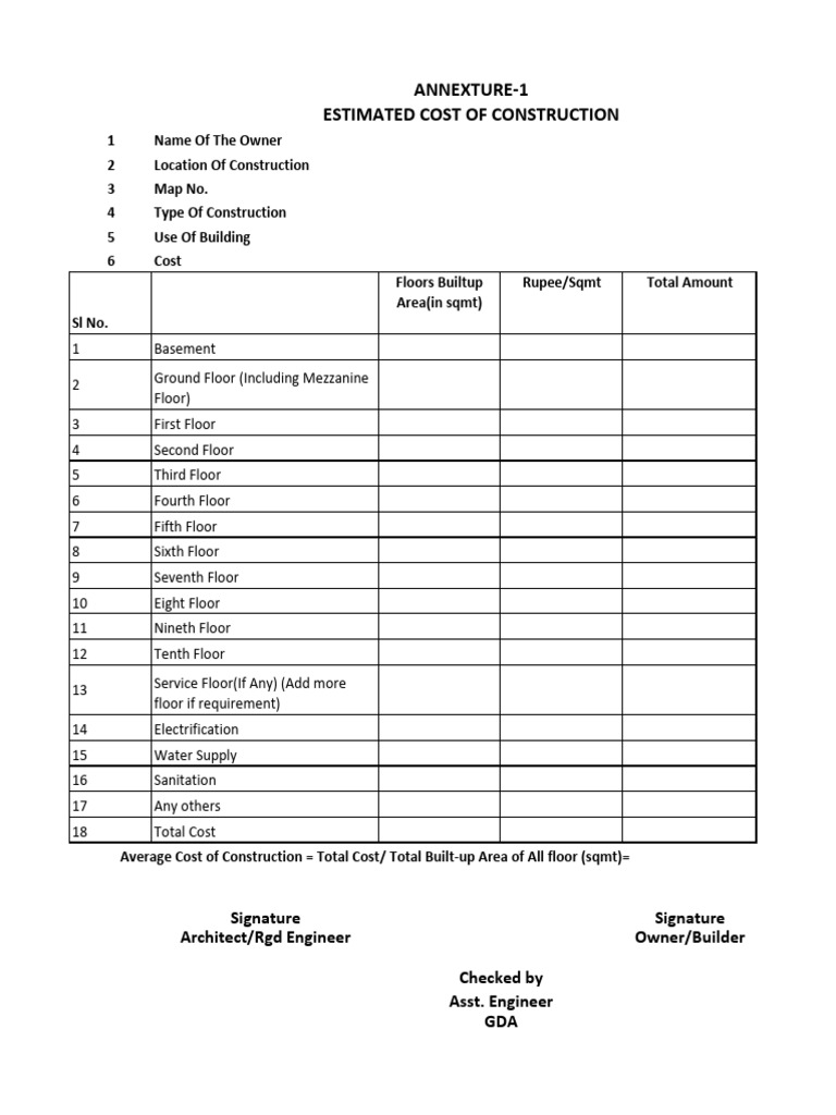 Average Cost of Construction = Total Cost/ Total Built-up Area of All floor (sqmt)=