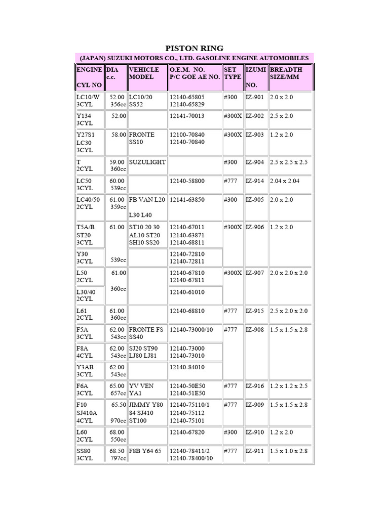 ENGINE DIA VEHICLE O.E.M. NO. SET IZUMI BREADTH