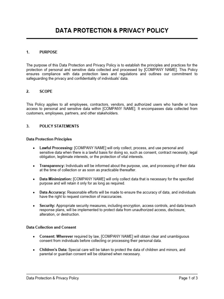 Data Minimization: [COMPANY NAME] will only collect data that is necessary for the specified