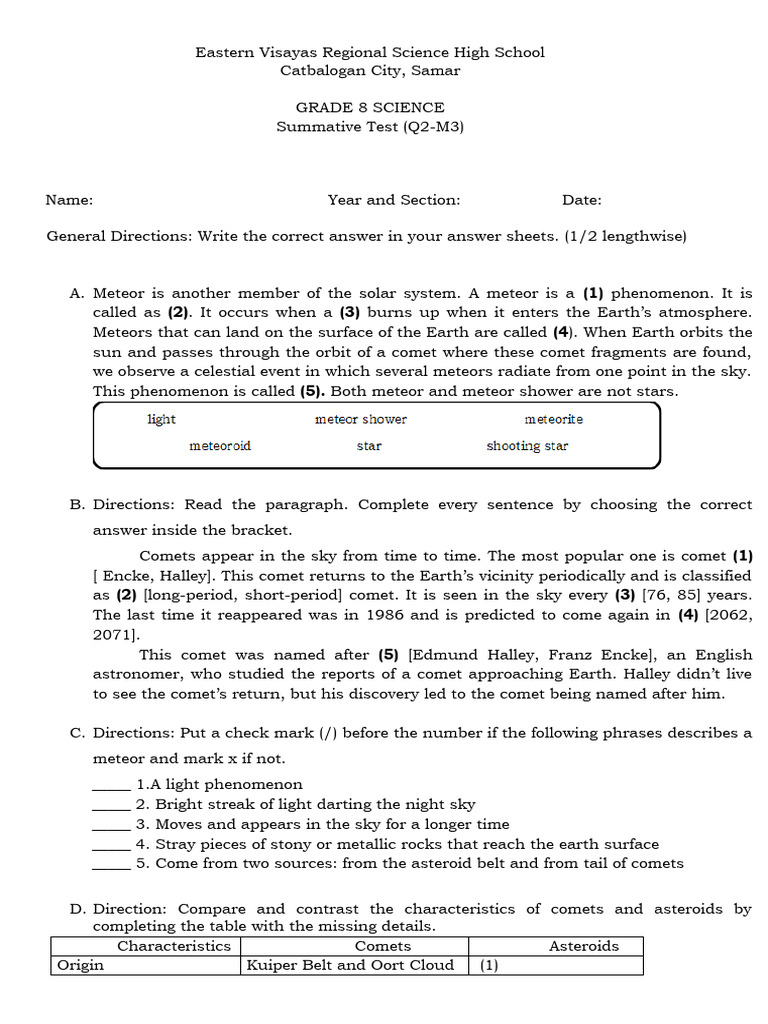 _____ 1. Comets orbit the sun and leave fragments along their orbit.