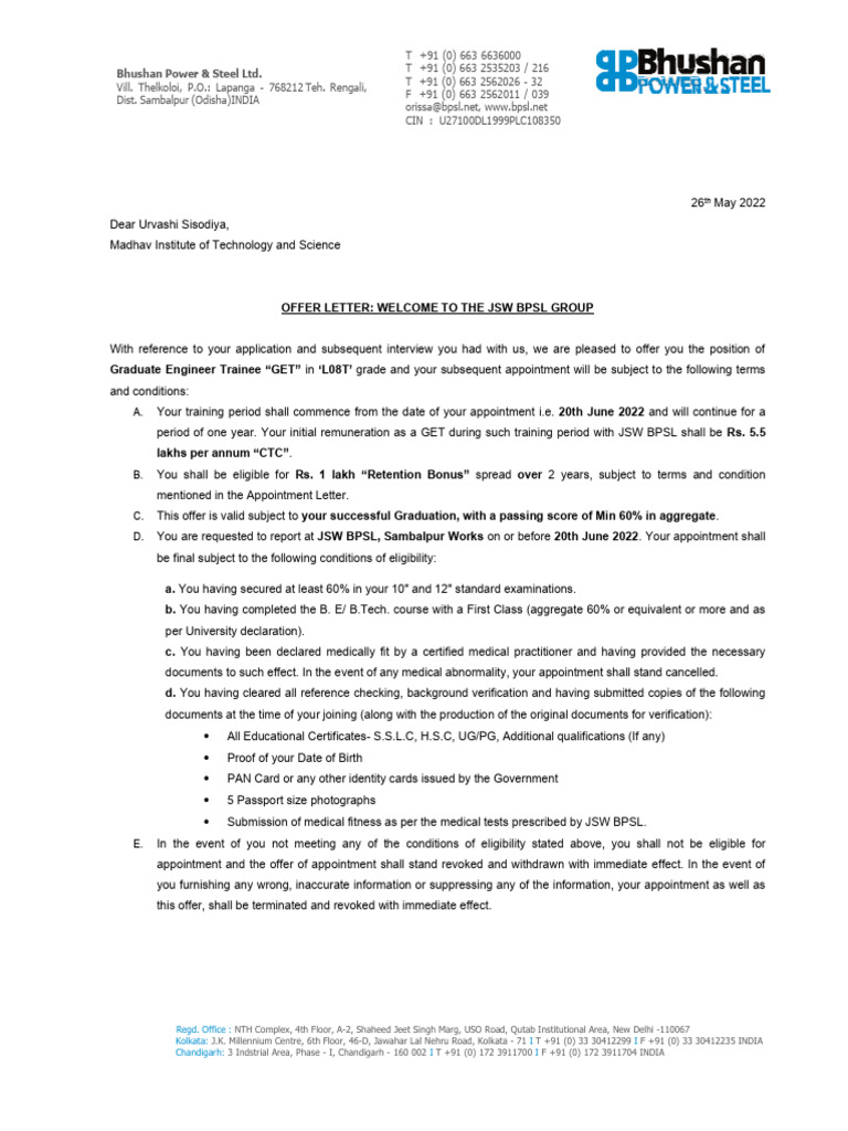 Urvashi Sisodiya has received an offer letter from JSW BPSL for the position of Graduate Engineer Trainee in the 'L08T' grade. The offer includes an initial annual remuneration of Rs. 5.5 lakhs and a retention bonus of Rs. 1 lakh over 2 years. Urvashi must report to JSW BPSL, Sambalpur Works by June 20th, 2022 and the offer is conditional on meeting eligibility criteria including educational qualifications and medical fitness. The terms of the offer are confidential and governed by the laws of India.