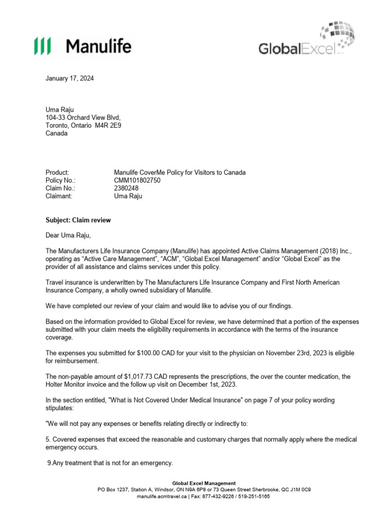 The expenses you submitted for $100.00 CAD for your visit to the physician on November 23rd, 2023 is eligible