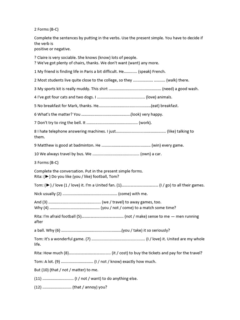 Complete the sentences by putting in the verbs. Use the present simple. You have to decide if