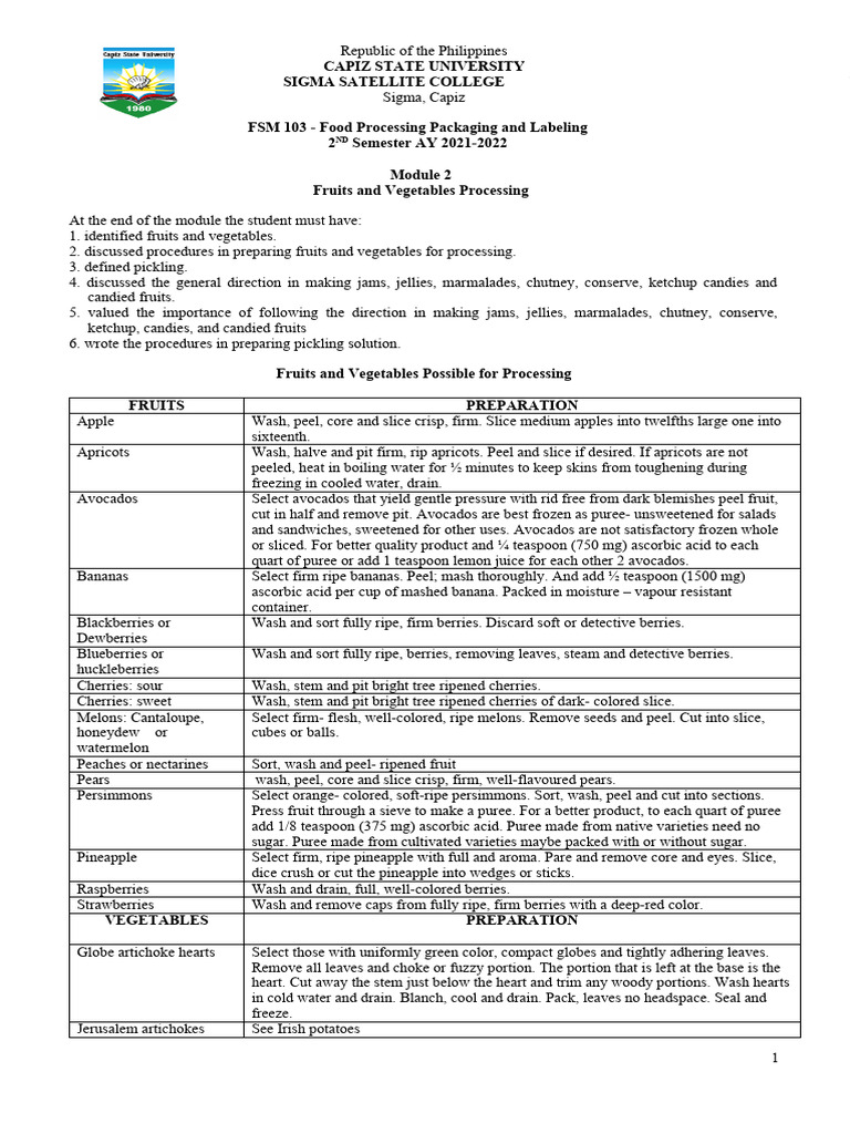 1. Discuss procedures in preparing fruits and vegetables for processing.