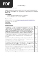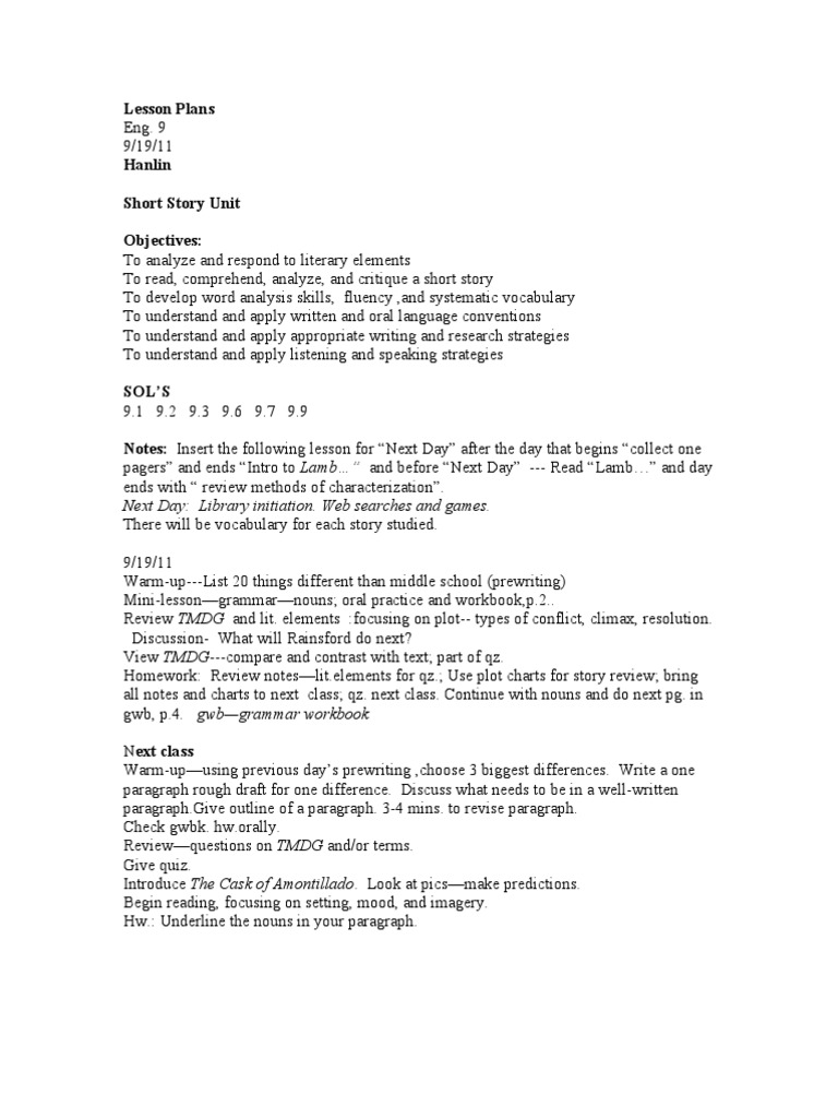 9 9/19/11 Hanlin Short Story Unit Objectives: To analyze and respond to literary elements To read, comprehend, analyze, and critique a short story To develop word analysis skills, fluency ,and systematic vocabulary To understand and apply written and oral language conventions To understand and apply appropriate writing and research strategies To understand and apply listening and speaking strategies SOLS 9.1 9.2 9.3 9.6 9.7 9.9 Notes: Insert the following lesson for Next Day after the day that begins collect one pagers and ends Intro to Lamb and before Next Day --- Read Lamb and day ends with review methods of characterization. Next Day: Library initiation. Web searches and games. There will be vocabulary for each story studied. 9/19/11 Warm-up---List 20 things different than middle school (prewriting) Mini-lessongrammarnouns; oral practice and workbook,p.2.. Review TMDG and lit. elements :focusing on plot-- types of conflict, climax, resolution. Discussion- What will Rainsford do next? View TMDG---compare and contrast with text; part of qz. Homework: Review noteslit.elements for qz.; Use plot charts for story review; bring all notes and charts to next class; qz. next class. Continue with nouns and do next pg. in gwb, p.4. gwbgrammar workbook Next class Warm-upusing previous days prewriting ,choose 3 biggest differences. Write a one paragraph rough draft for one difference. Discuss what needs to be in a well-written paragraph.Give outline of a paragraph. 3-4 mins. to revise paragraph. Check gwbk. hw.orally. Reviewquestions on TMDG and/or terms. Give quiz. Introduce The Cask of Amontillado. Look at picsmake predictions. Begin reading, focusing on setting, mood, and imagery. Hw.: Underline the nouns in your paragraph.