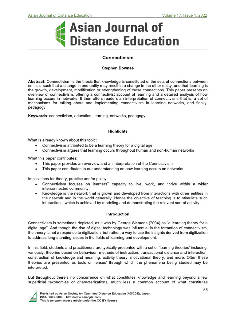 Downes, S. (2022). Connectivism. Asian Journal of Distance Education, 17(1), 58-87.