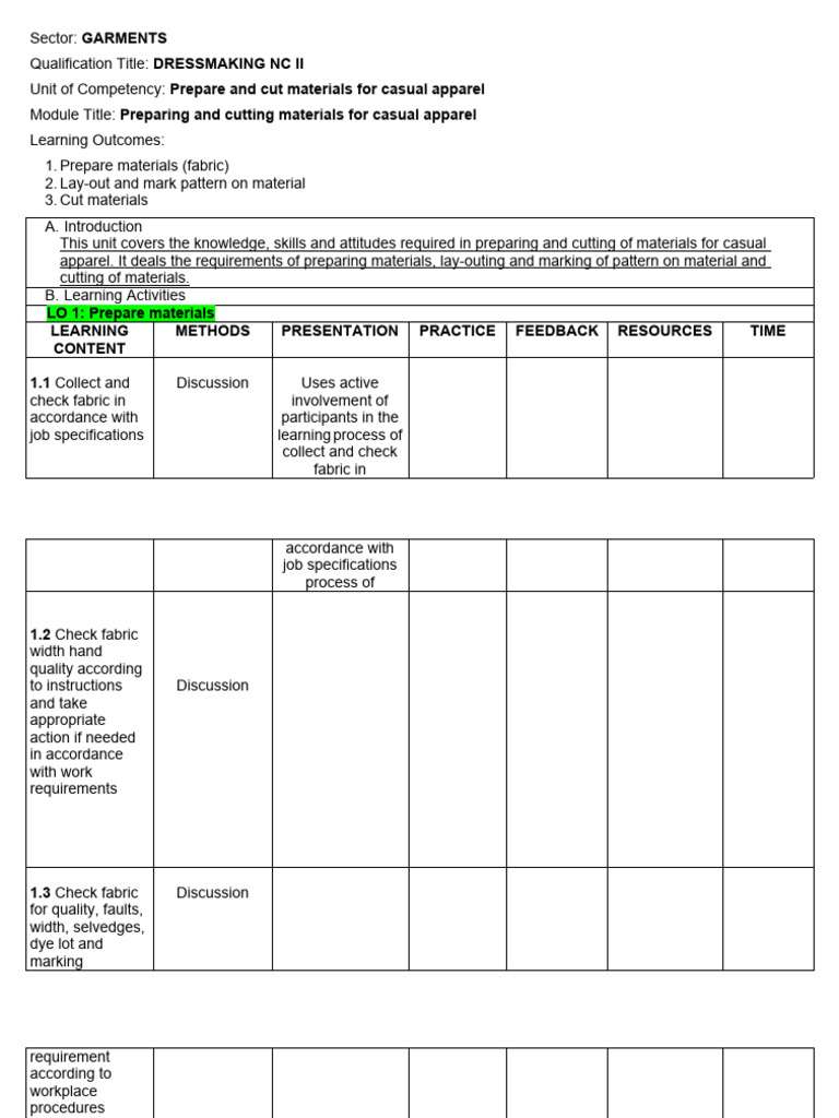 Unit of Competency: Prepare and cut materials for casual apparel