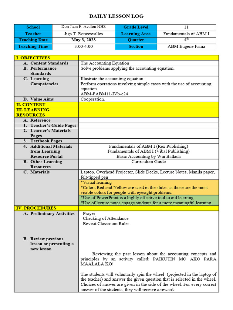 Teacher Jigs T. Roncesvalles Learning Area Fundamentals of ABM I