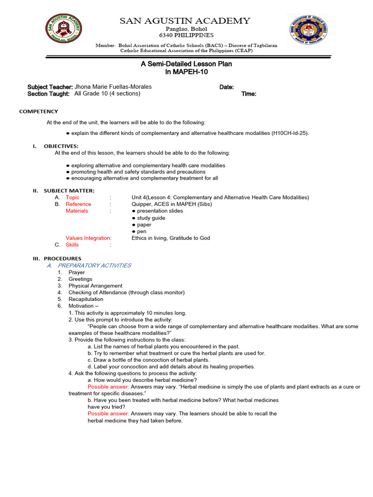 ● explain the different kinds of complementary and alternative healthcare modalities (H10CH-Id-25).