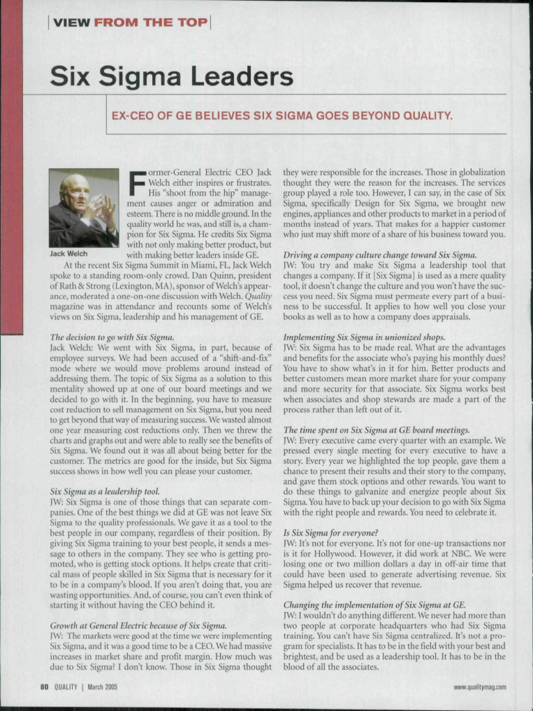 At the recent Six Sigma Summit in Miami, FL, Jack Welch |W: You try and make Six Sigma a leadership lool that