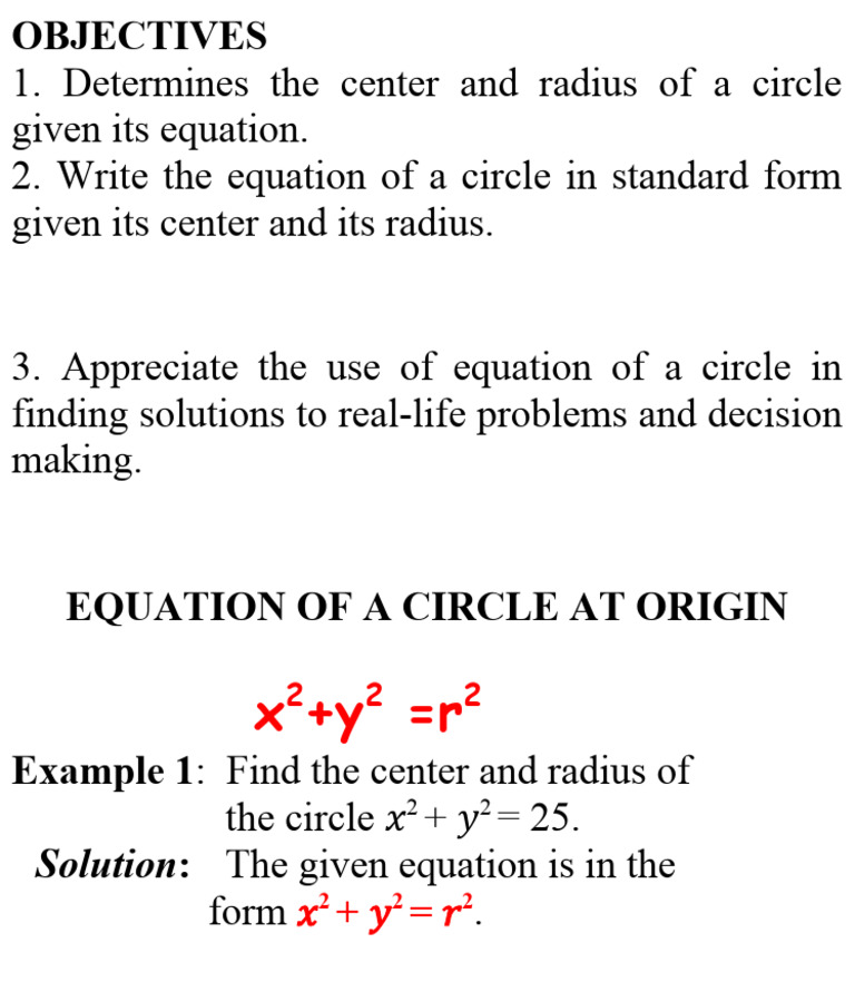 1. A circle defined by 𝑥 + 𝑦 = 9 has a graph whose center is at