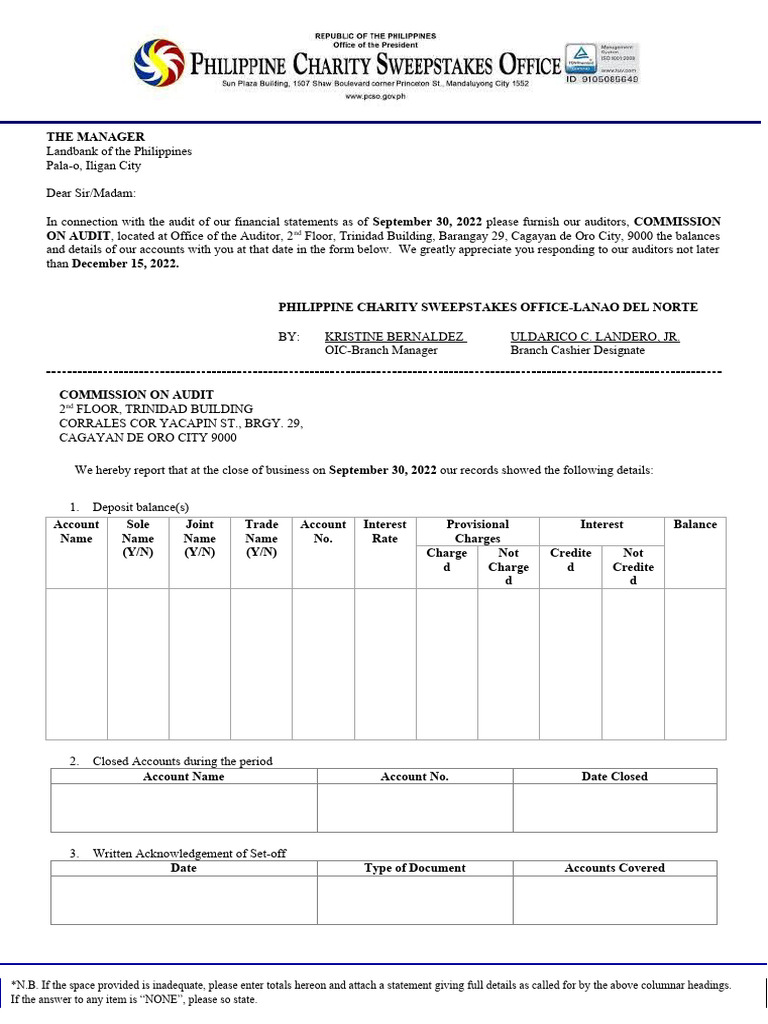 ON AUDIT, located at Office of the Auditor, 2 nd Floor, Trinidad Building, Barangay 29, Cagayan de Oro City, 9000 the balances