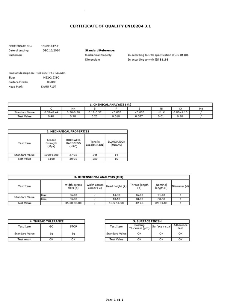 Customer: Mechanical Property: In according to with specification of JIS B1186
