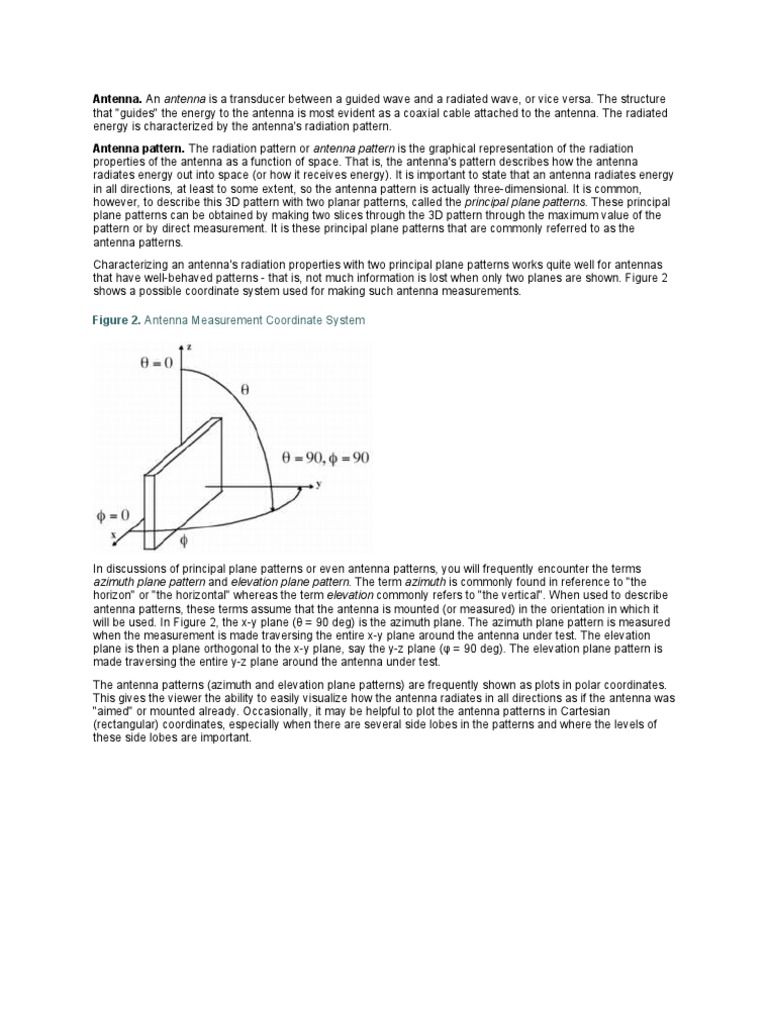 The structure that "guides" the energy to the antenna is most evident as a coaxial cable attached to the antenna. The radiated energy is characterized by the antenna's radiation pattern. Antenna pattern. The radiation pattern or antenna pattern is the graphical representation of the radiation properties of the antenna as a function of space. That is, the antenna's pattern describes how the antenna radiates energy out into space (or how it receives energy). It is important to state that an antenna radiates energy in all directions, at least to some extent, so the antenna pattern is actually three-dimensional. It is common, however, to describe this 3D pattern with two planar patterns, called the principal plane patterns. These principal plane patterns can be obtained by making two slices through the 3D pattern through the maximum value of the pattern or by direct measurement. It is these principal plane patterns that are commonly referred to as the antenna patterns. Characterizing an antenna's radiation properties with two principal plane patterns works quite well for antennas that have well-behaved patterns - that is, not much information is lost when only two planes are shown. Figure 2 shows a possible coordinate system used for making such antenna measurements. Figure 2. Antenna Measurement Coordinate System