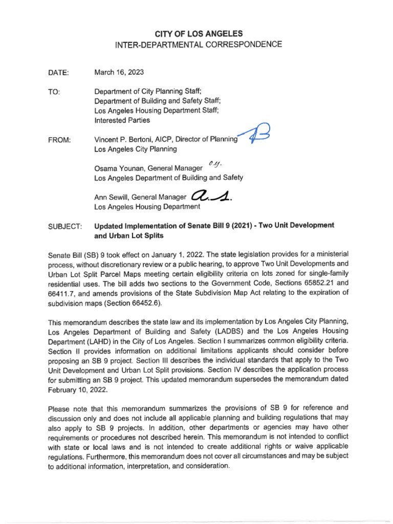This memorandum reflects the information on SB 9 as it is understood at this time and may be