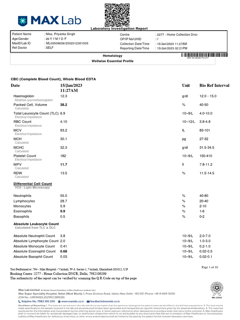 Patient Name : Miss. Priyanka Singh Centre : 2277 - Home Collection Dncr