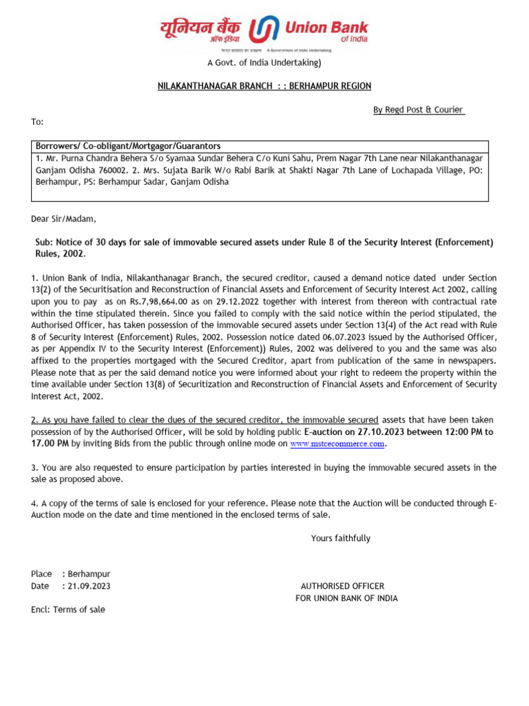 Borrower, Mortgagor & Guarantors: 1. Mr. Purna Chandra Behera S/o Syamaa Sundar Behera C/o Kuni Sahu, Prem