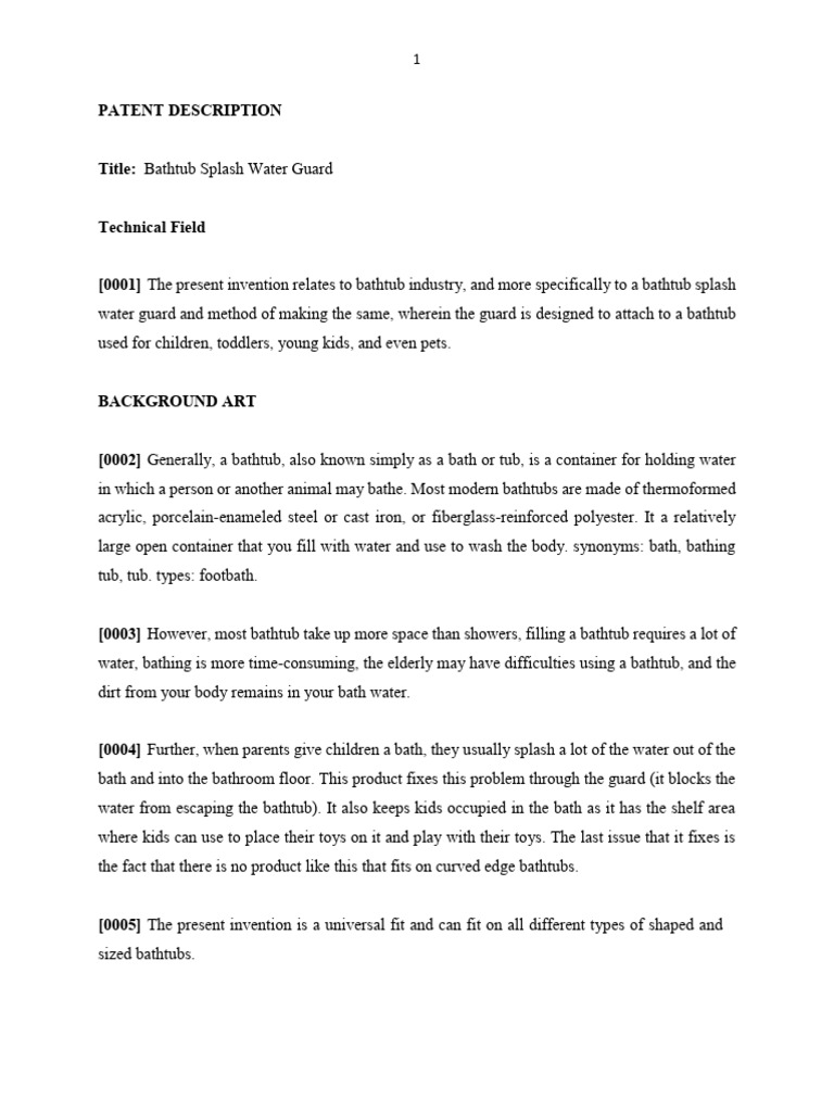 [0013] The product is basically a guard that sticks to the edge of a bathtub. The purpose of it is so