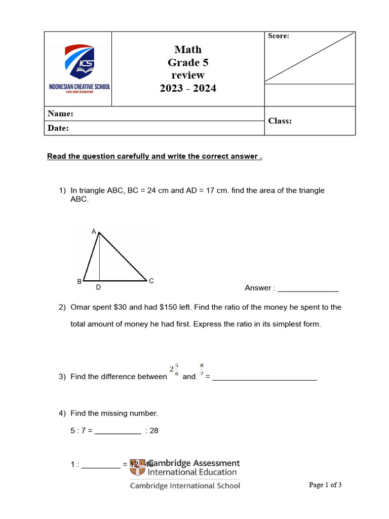 1) In triangle ABC, BC = 24 cm and AD = 17 cm. find the area of the triangle