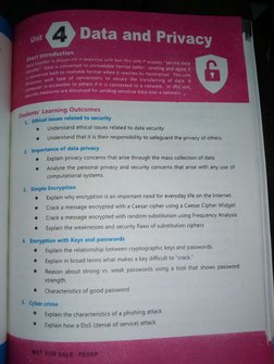 Data and Privacy Overview: Provides a brief introduction to the topics of data and privacy, outlining learning outcomes related to data security and encryption. Ethical Issues Related to Data Security: Explores ethical issues, including confidentiality, privacy, fraud, patents, trade secrets, and sabotage, related to data security. Safeguarding Privacy of Others: Provides guidance on protecting others' privacy using CCTV, privacy policies, and secure data practices. Simple Encryption: Covers basic methods of encrypting data and their importance for securing information. Cybercrime: Examines various types of cybercrime including identity theft, transaction fraud, hacking, and phishing. Summary and Exercises: Summarizes key points from the chapter and presents exercises for testing comprehension. dable format when it reaches
