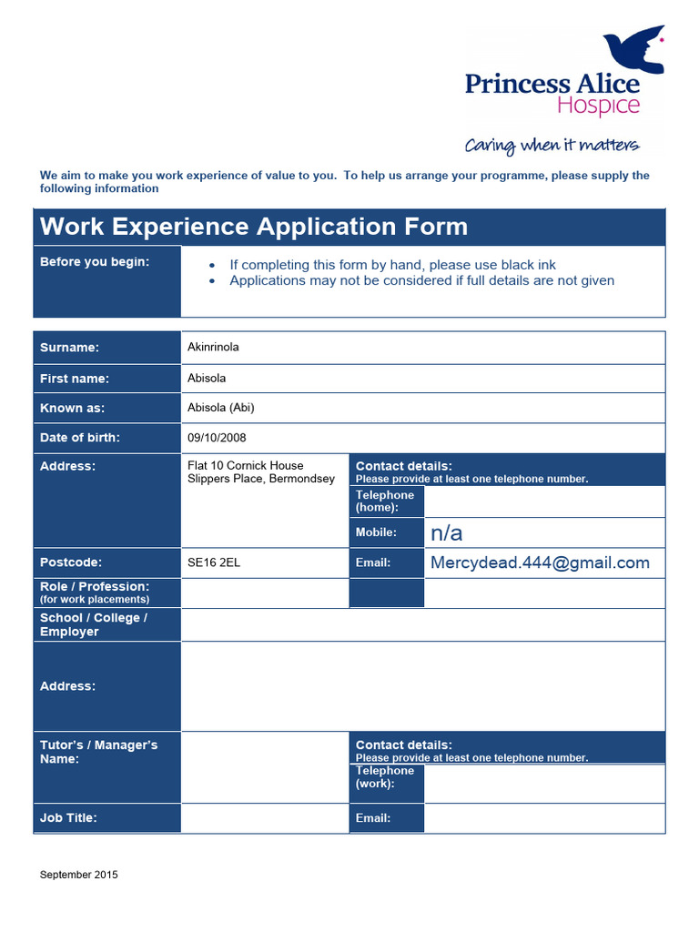 Work Experience Application Form