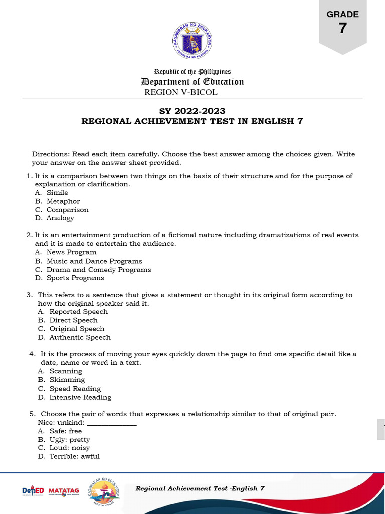 REGIONAL ACHIEVEMENT TEST IN ENGLISH 7