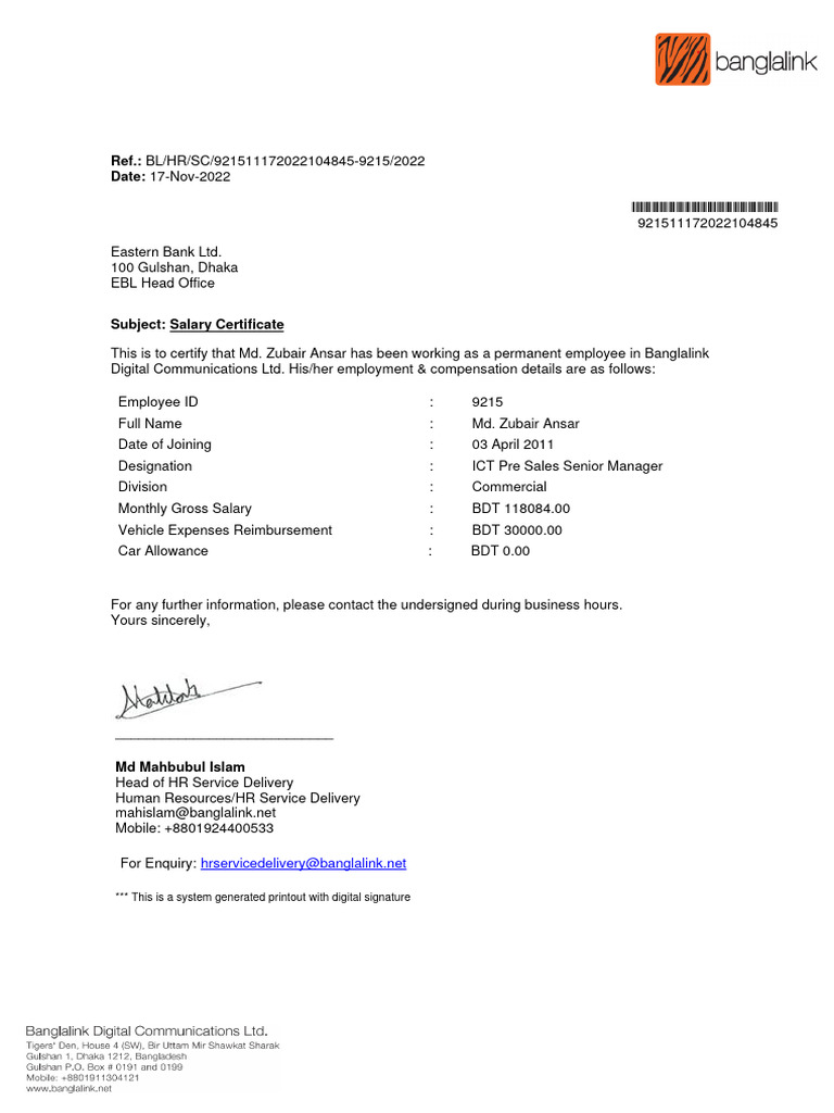 This is to certify that Md. Zubair Ansar has been working as a permanent employee in Banglalink