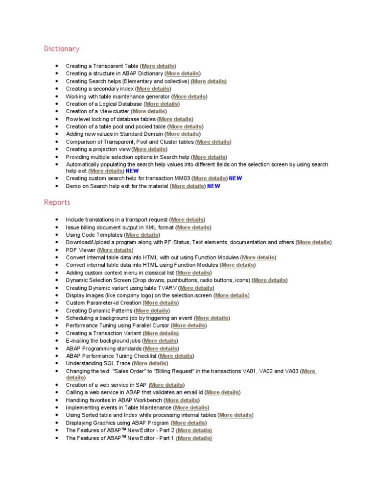 Include translations in a transport request (More details) Issue billing document output in XML format (More details) Using Code Templates (More details) Download/Upload a program along with PF-Status, Text elements, documentation and others (More details) PDF Viewer (More details) Convert internal table data into HTML with out using Function Modules (More details) Convert internal table data into HTML using Function Modules (More details) Adding custom context menu in classical list (More details) Dynamic Selection Screen (Drop downs, pushbuttons, radio buttons, icons) (More details) Creating Dynamic variant using table TVARV (More details) Display images (like company logo) on the selection-screen (More details) Custom Parameter-id Creation (More details) Creating Dynamic Patterns (More details) Scheduling a background job by triggering an event (More details) Performance Tuning using Parallel Cursor (More details) Creating a Transaction Variant (More details) E-mailing the background jobs (More details) ABAP Programming standards (More details) ABAP Performance Tuning Checklist (More details) Understanding SQL Trace (More details) Changing the text "Sales Order" to "Billing Request" in the transactions VA01, VA02 and VA03 (More details) Creation of a web service in SAP (More details) Calling a web service in ABAP that validates an email id (More details) Handling favorites in ABAP Workbench (More details) Implementing events in Table Maintenance (More details) Using Sorted table and Index while processing internal tables (More details) Displaying Graphics using ABAP Program (More details) The Features of ABAPTM New Editor - Part 2 (More details) The Features of ABAPTM New Editor - Part 1 (More details)