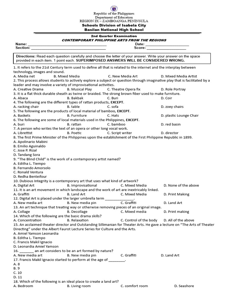 Directions: Read each question carefully and choose the letter of your answer. Write your answer on the space
