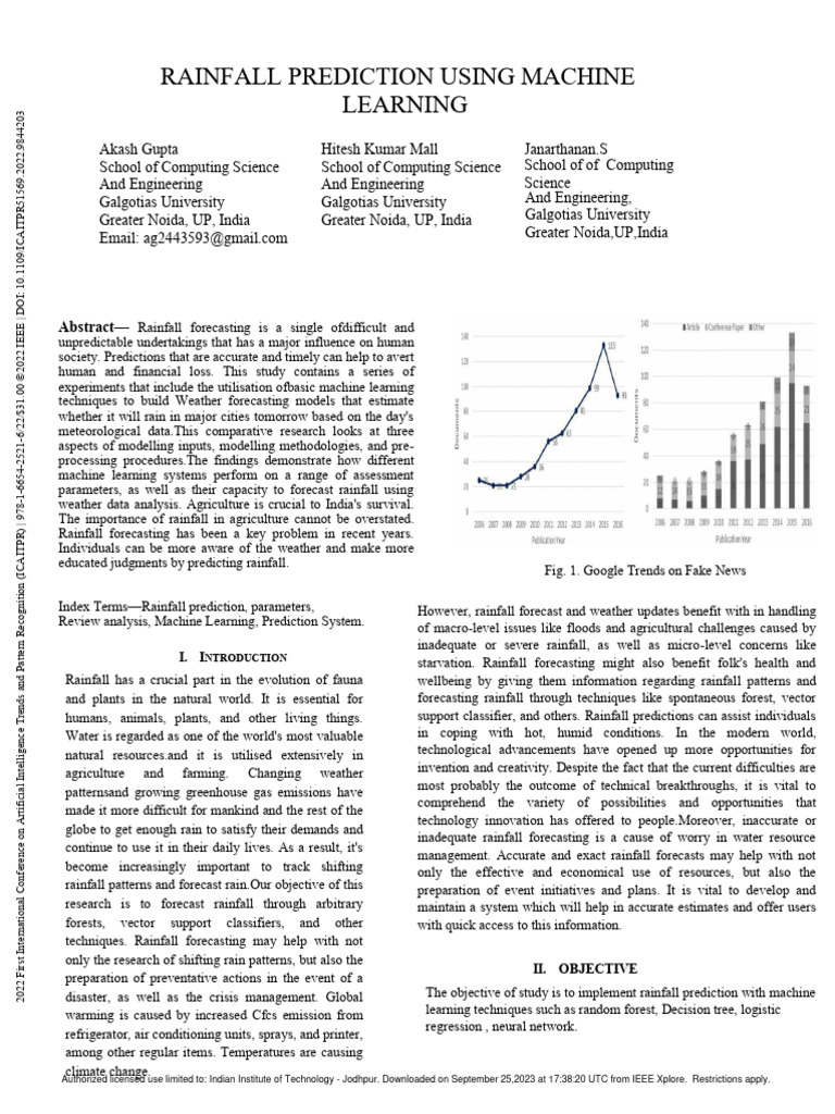 disaster, as well as the crisis management. Global The objective of study is to implement rainfall prediction with machine