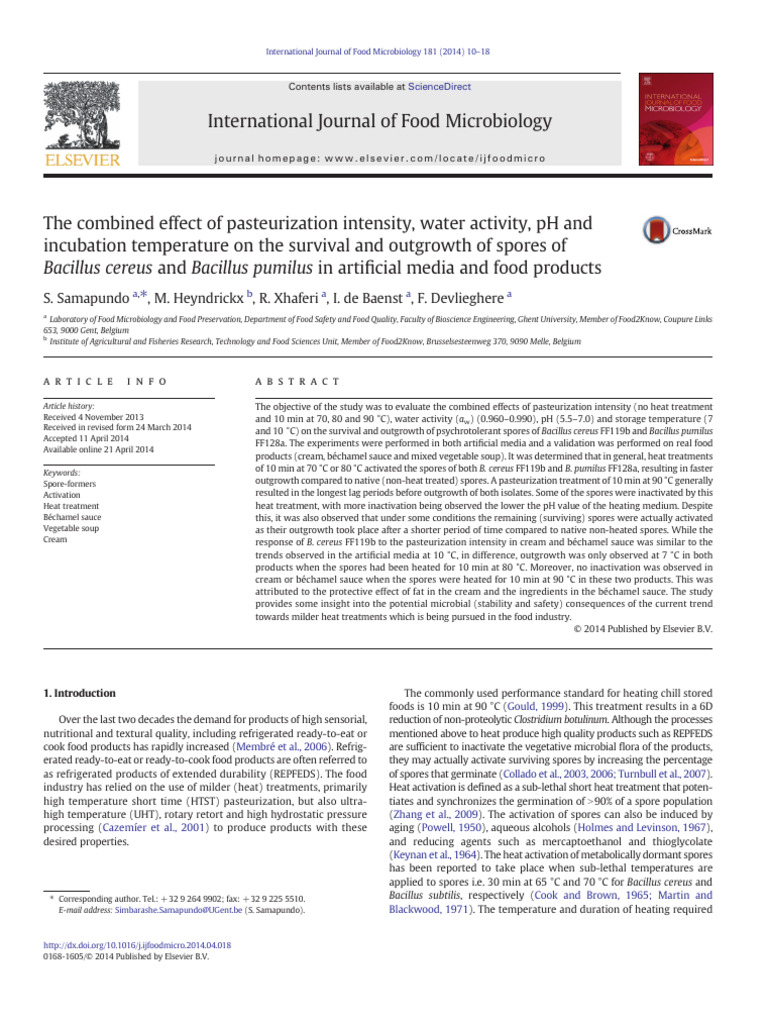 deactivation of Bacillus cereus spores. Food Microbiol. 20, 545–548. sauce. J. Food Prot. 74, 1662–1669.