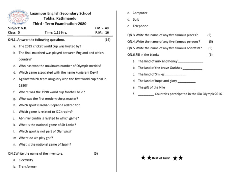 QN.4.Write the name of any five famous persons? (5)