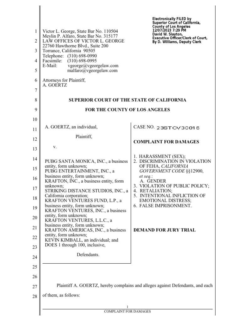 A. GOERTZ, an individual, Plaintiff, v.PUBG SANTA MONICA, INC., a businessentity, form unknown; PUBG ENTERTAINMENT, INC., a business entity, form unknown; KRAFTON, INC., a business entity, formunknown;STRIKING DISTANCE STUDIOS, INC., aCalifornia corporation;KRAFTON VENTURES FUND, L.P., a business entity, form unknown; KRAFTON VENTURES, INC., a businessentity, form unknown; KRAFTON VENTURES, L.L.C., a business entity, form unknown; KRAFTON AMERICAS, INC., a businessentity, form unknown; KEVIN KIMBALL, an individual; andDOES 1 through 100, inclusive, Defendants.CASE NO.