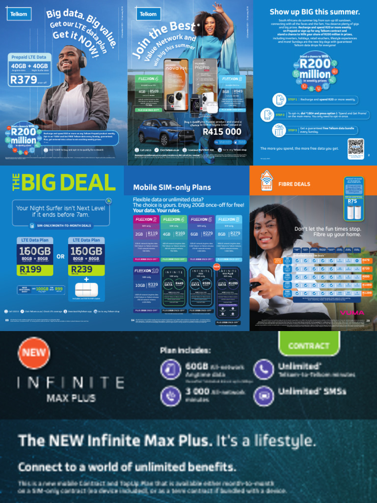 26 Find out more on our fibre coverage at secure.telkom.co.za/today/ucm/. Standard T&C apply. E&OE. Deals valid from 1 December 2023 – 31 January 2024. Standard ISP terms and conditions apply and can be viewed at www.telkom.co.za. E&OE. Fibre bundles and infrastructure available on Openserve Fibre network. Terms and conditions apply and can be viewed at www.telkom.
