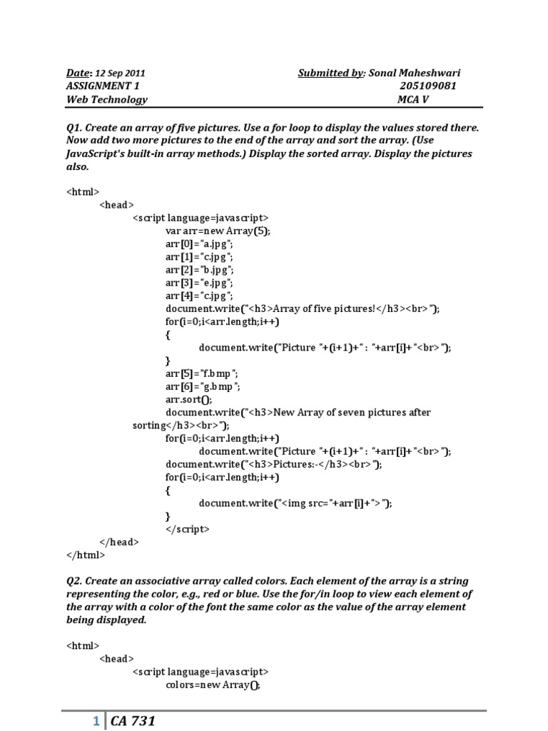 Q1. Create an array of five pictures. Use a for loop to display the values stored there. Now add two more pictures to the end of the array and sort the array. (Use JavaScript's built-in array methods.) Display the sorted array. Display the pictures also. <html> <head> <script language=javascript> var arr=new Array(5); arr[0]="a.jpg"; arr[1]="c.jpg"; arr[2]="b.jpg"; arr[3]="e.jpg"; arr[4]="c.jpg"; document.write("<h3>Array of five pictures!</h3><br>"); for(i=0;i<arr.length;i++) { document.write("Picture "+(i+1)+" : "+arr[i]+"<br>"); } arr[5]="f.bmp"; arr[6]="g.bmp"; arr.sort(); document.write("<h3>New Array of seven pictures after sorting</h3><br>"); for(i=0;i<arr.length;i++) document.write("Picture "+(i+1)+" : "+arr[i]+"<br>"); document.write("<h3>Pictures:-</h3><br>"); for(i=0;i<arr.length;i++) { document.write("<img src="+arr[i]+">"); } </script> </head> </html> Q2. Create an associative array called colors. Each element of the array is a string representing the color, e.g., red or blue. Use the for/in loop to view each element of the array with a color of the font the same color as the value of the array element being displayed. <html> <head> <script language=javascript> colors=new Array();