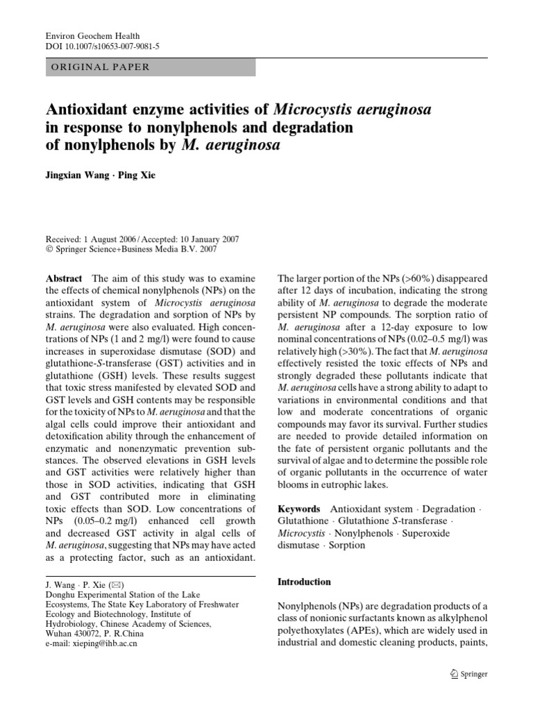with nonylphenol in aquatic microcosms. Environ- Wang, J., Xie, P., & Guo, N. (2007). Effects of nonylphe-